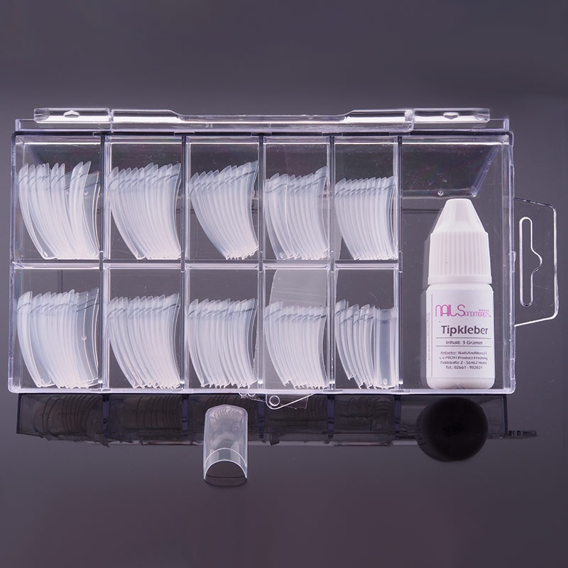 - 1 x Tipbox* gefüllt mit Tips C-Kurve kurzer Ansatz Crystal-Klar in der Größen 0-9 ( 10 Stück pro Größe ) sowie 1 x Tipkleber 3 Gramm