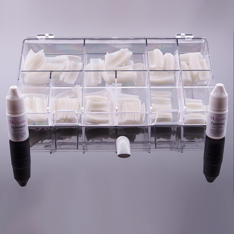 Tipbox aus Kunsstoff mit 10 Fächern für Tips. Zusätzlich ausgestattet mit einem Extrafach für kleine Werkzeuge - Nagelhautschieber etc. Jedes der 10 Fächer gefüllt mit 25 hoch qualitativen, flexiblen Tips die nicht brechen in den Größen 1 - 10 - langer Ansatz. Zusätzlich gibt es zwei Tipkleber 3 Gramm. Damit können Sie direkt starten ;-)